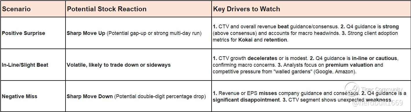 Whipsaw Effect: The initial after-hours move can be misleading. Often, the forward guidance and commentary on CTV/Kokai adoption are more impactful than the absolute Q3 headline numbers.