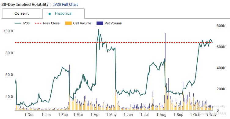 TTD implied volatility (IV) is 92.9, which is in the 98% percentile rank. This means that 98% of the time the IV was lower in the last year than the current level. The current IV (92.9) is 5.0% above its 20 day moving average (88.4) indicating implied volatility is trending higher.