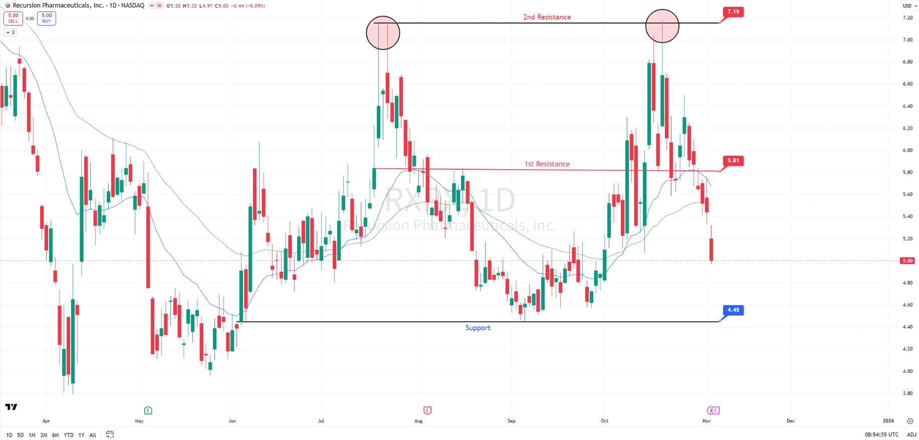 RXRX is a small-cap, loss-making biotech with binary event risk around clinical and partnership news; price can move sharply in both directions, especially around earnings and data releases. This note is for technical reference only, does not constitute investment advice, and does not consider your individual financial situation or risk tolerance.