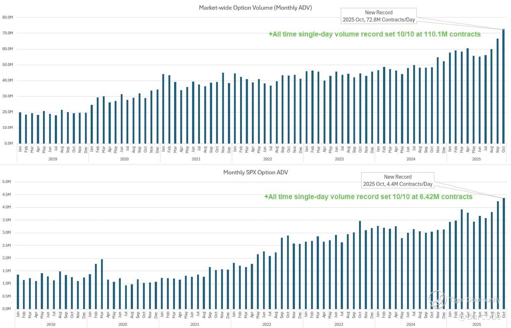 October 2025 has shattered every historical record for options activity. Market-wide average daily volume hit 72.8M contracts, with a jaw-dropping single-day record of 110.1M on 10Oct25. SPX options also set new highs at 4.4M per day and 6.42M in one session. With two months left, crossing 14 billion total contracts this year looks entirely possible. This surge reflects not just enthusiasm but structural evolution. Institutional hedging, retail momentum, and algorithmic scalping have converged into a feedback loop that now defines intraday volatility.