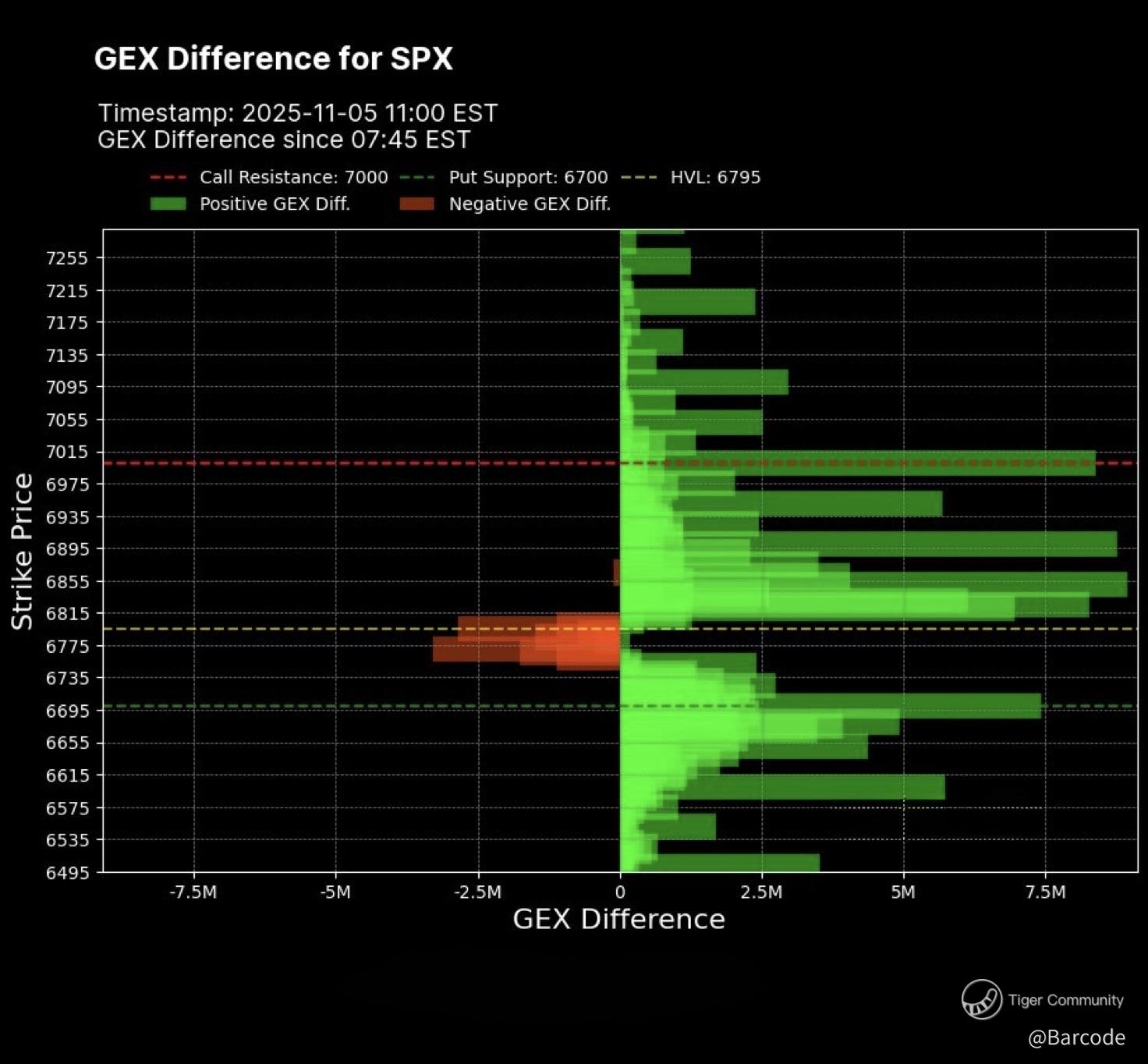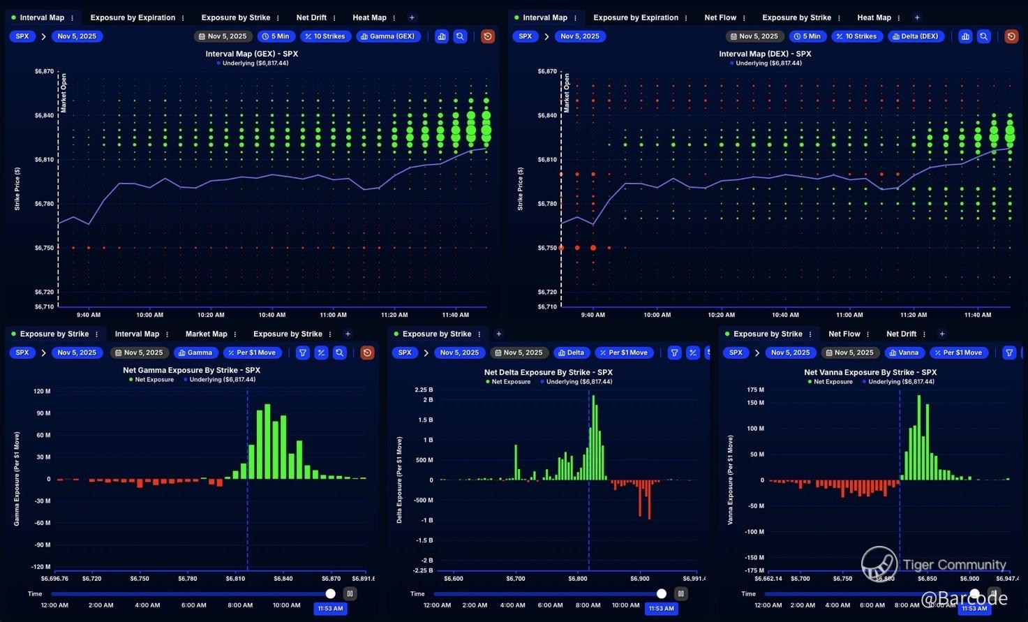 At 11:00 EST, the GEX Difference map glowed green. Positive gamma dominated from 6700 to 7000 while the small negative cluster around 676 was swiftly neutralised. The HVL level near 6795 now forms a soft ceiling; put support near 6700 provides a resilient base. This is the anatomy of a gamma-stabilised rally. Gamma, Delta, and Vanna exposures have aligned in bullish synchrony. Net gamma concentration around 6817 strengthens directional conviction. Delta flow confirms long-side dominance. Vanna’s positive skew enhances dealer hedging pressure to buy dips, reinforcing the controlled melt-up.