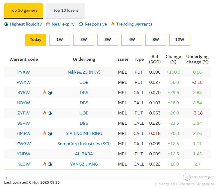 🔧Trending UOB call warrant $UOB MB eCW260330(9MRW.SI)$ (https://warrants.com.sg/tools/livematrix/9MRW) is down 25% to SGD 0.042 while trending DBS put warrant $DBS MB ePW260316(NATW.SI)$ (https://warrants.com.sg/tools/livematrix/NATW) is down 19.7% to SGD 0.049