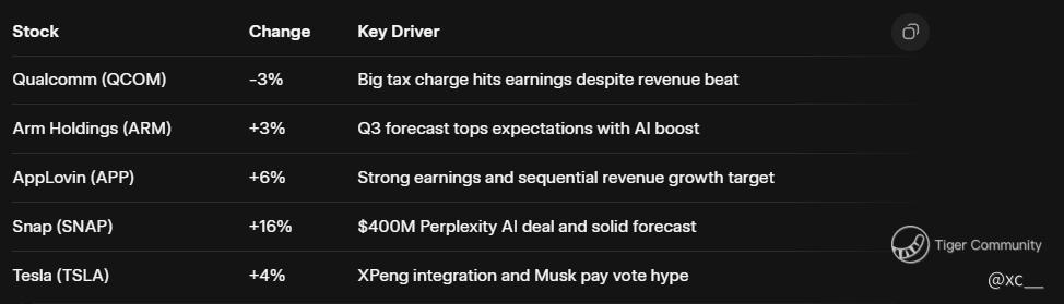 AppLovin stole the spotlight, rocketing 6% on killer earnings and guidance that had analysts cheering—revenue hit new heights, proving mobile ads are still gold. 🚀 Snap? Absolute beast mode! Shares skyrocketed 16% thanks to a jaw-dropping $400 million deal with Perplexity AI, plus a forecast that screams growth. If you're into social snaps turning into cash stacks, this one's electric. ⚡ And Tesla charged ahead 4%, fueled by XPeng's full embrace of Tesla tech—autonomous dreams are accelerating, especially with today's shareholder vote on Elon Musk's mega-pay package adding extra voltage.