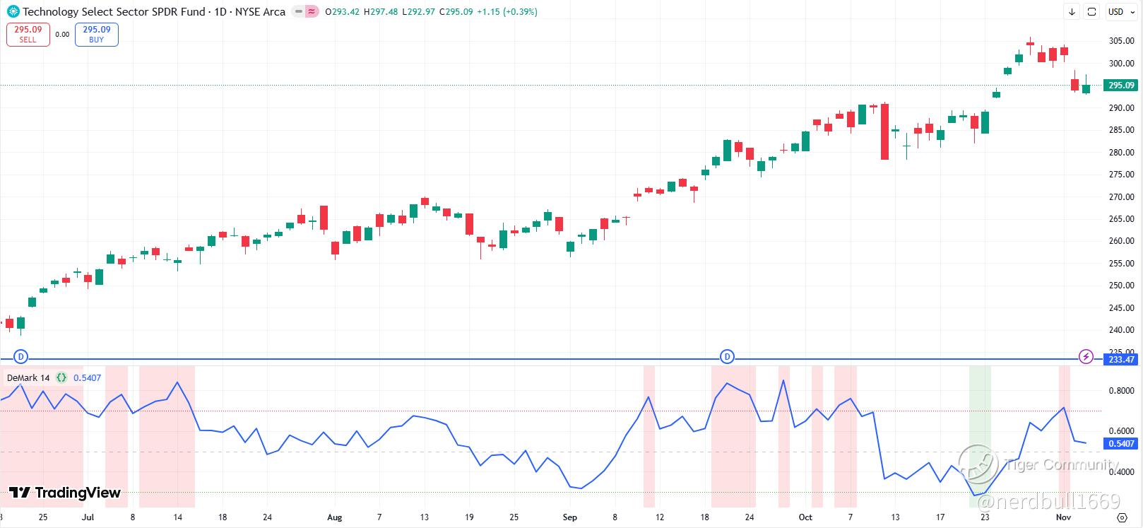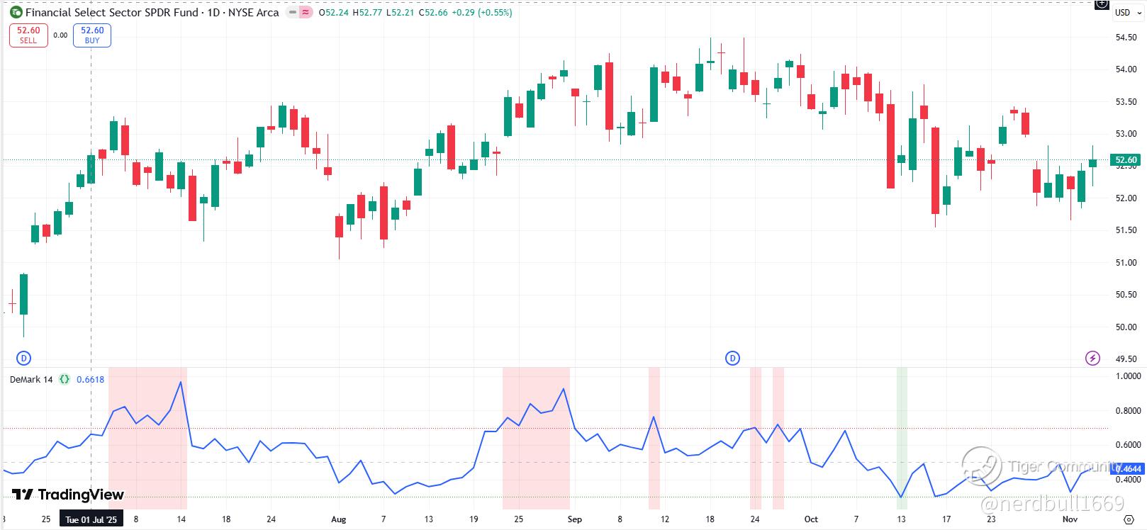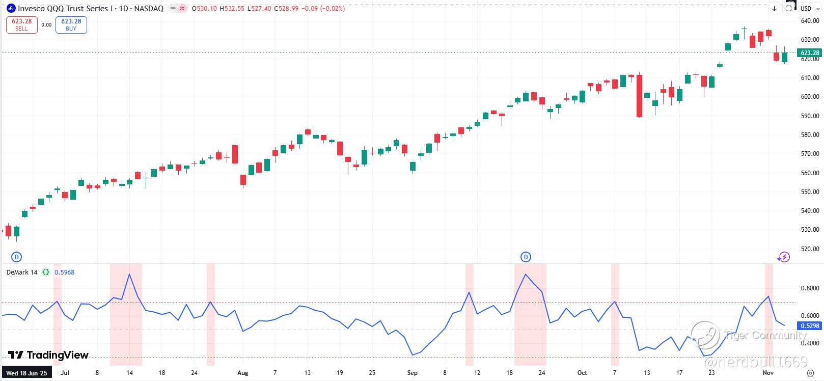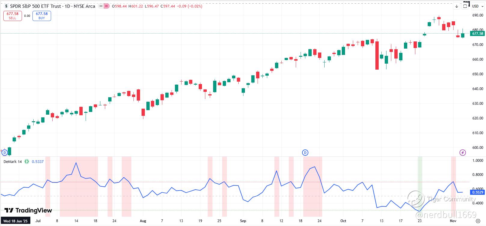 In the next section, we pulled the most-recent daily OHLC for SPY / QQQ / XLK / XLF (10-06-2025 → 11-05-2025) and computed a 14-period DeMarker (DeM(14)) series and a small empirical analogue test (what happened after similar DeM values over the sample). Below are the results, the interpretation, and clear caveats about the sample size.