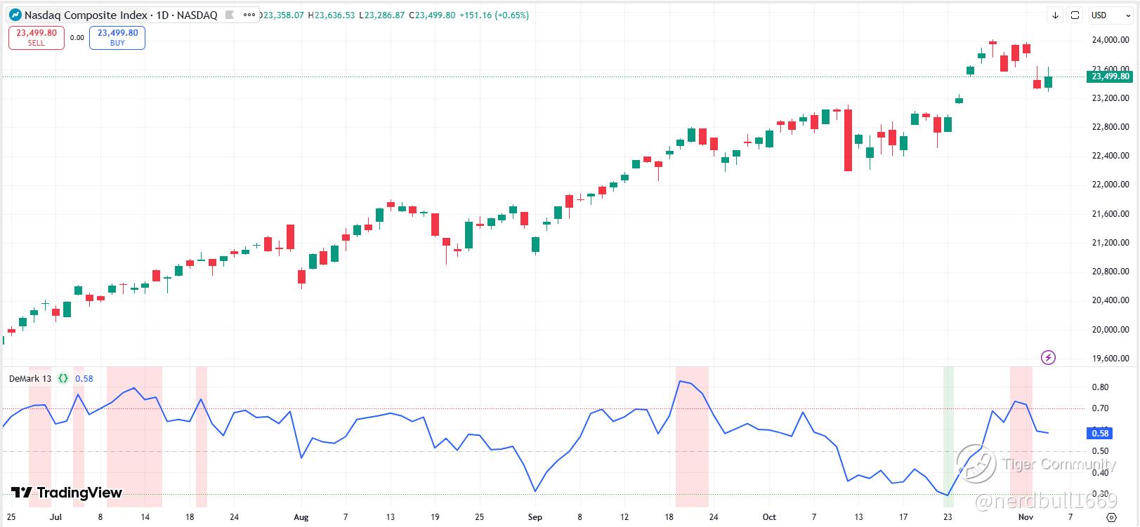 Check the DeMarker reading for the indices (S&P 500 / Nasdaq) and/or for major sectors/components: Is it above ~0.70? Is it curling down (roll-over)?