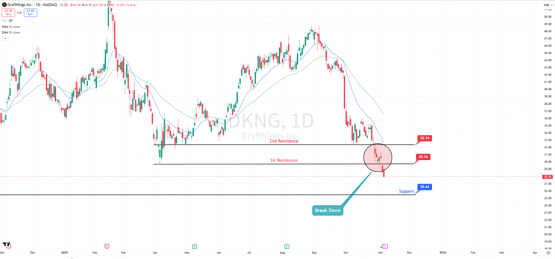 DraftKings closed at $27.92, down 2.41% on the volume of ~17.15M shares – suggests selling pressure continues. The stock trades ≈42% below its confirmed 52-week high of $53.61 and remains in a sustained downtrend.