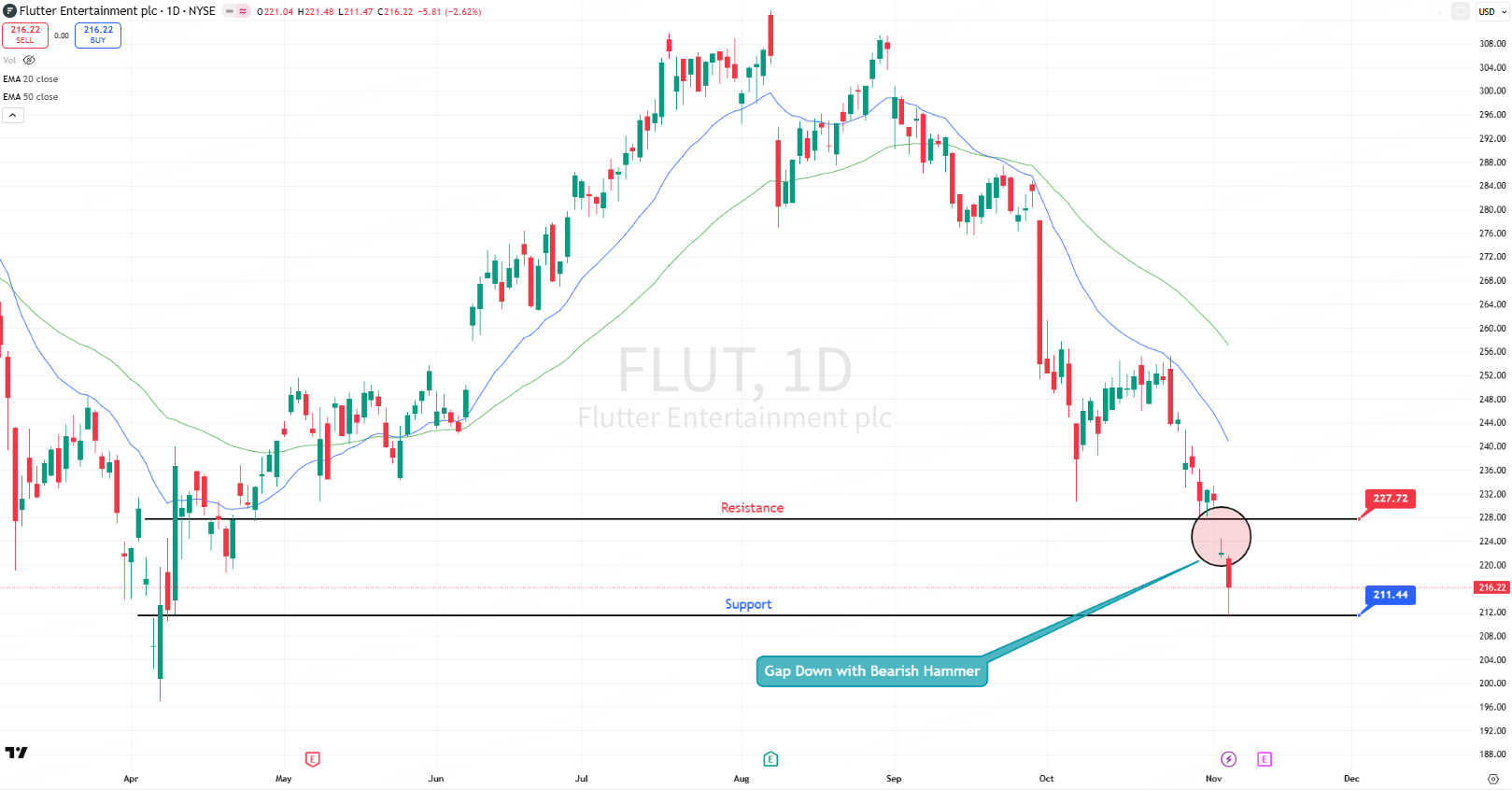 Flutter Entertainment closed at $216.22, down 2.62% on elevated volume of 4.09M shares – suggests institutional distribution.