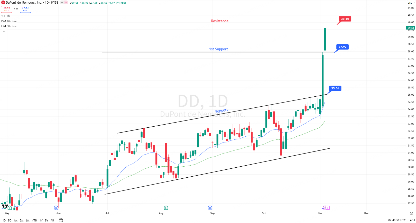 DuPont surged to $39.63, gaining 4.95% on heavy volume of 15.79M shares (87% above average) – indicating strong institutional positioning ahead of today's earnings report.