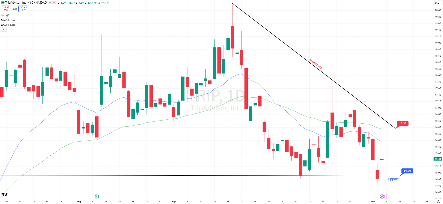 TripAdvisor, Inc. (TRIP) closed at $15.43, up +4.19%. The stock has experienced 4.47% YTD growth, and today's gain is part of a broader rally from the $14.80 support level, reflecting an optimistic short-term outlook.
