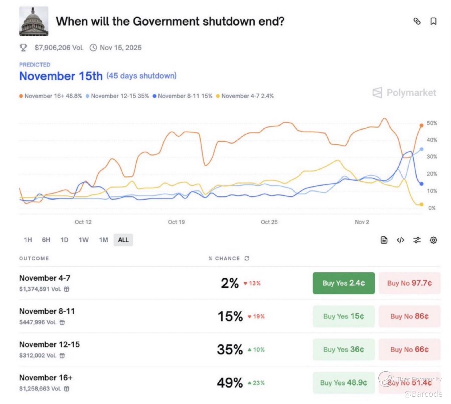 I’ve navigated more market cyclones than I care to count over my 25 years in the trenches, and this shutdown hits different; day 37 as of November 7, 2025, officially the longest in U.S. history, eclipsing the 35-day 2018–19 saga. It’s not mere political theatre; it’s a liquidity vacuum sucking billions from circulation, hammering consumer sentiment, and stressing essential services. Yet I’ve seen these storms before, and they always break, unleashing pent-up flows that propel defensives first, then growth with serious velocity. Prediction markets flipped hard overnight; Polymarket and Kalshi now price 62–68% probability of a resolution by November 15, up sharply after Trump’s breakfast summit lit a fire under GOP senators.