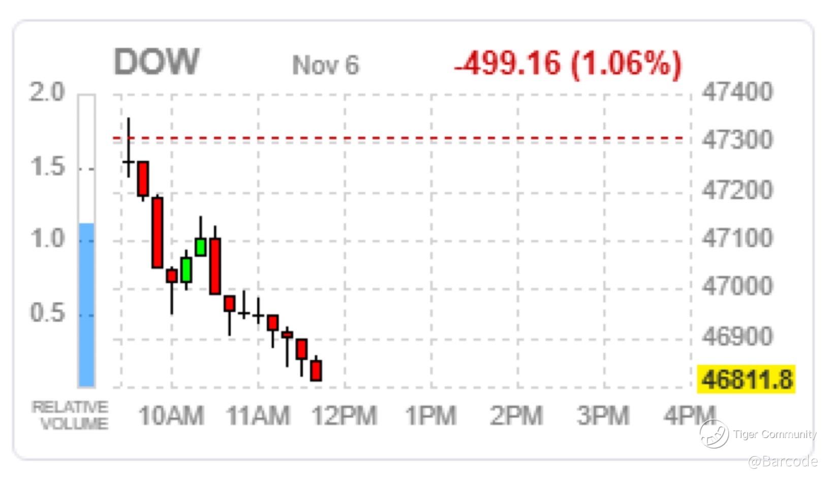 I’m watching the Dow Jones Industrial Average plunge nearly 500 points, sliding to 46,811.8, its worst single-day loss since 10Oct25. The tape screamed distribution from the open; a fleeting dead-cat bounce mid-morning fooled a few optimists before selling resumed in a straight line into midday. Relentless red candles, heavy volume, and collapsing breadth made this a textbook institutional unwind, not a retail panic.