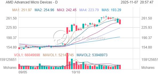 Advanced Micro Devices closed at $237.70, down −7.27%, trading $235.75–$253.51 on 65.7M shares versus 58.7M average (~1.12×). The stock now trades roughly 11% below its 52-week high ($267.08).