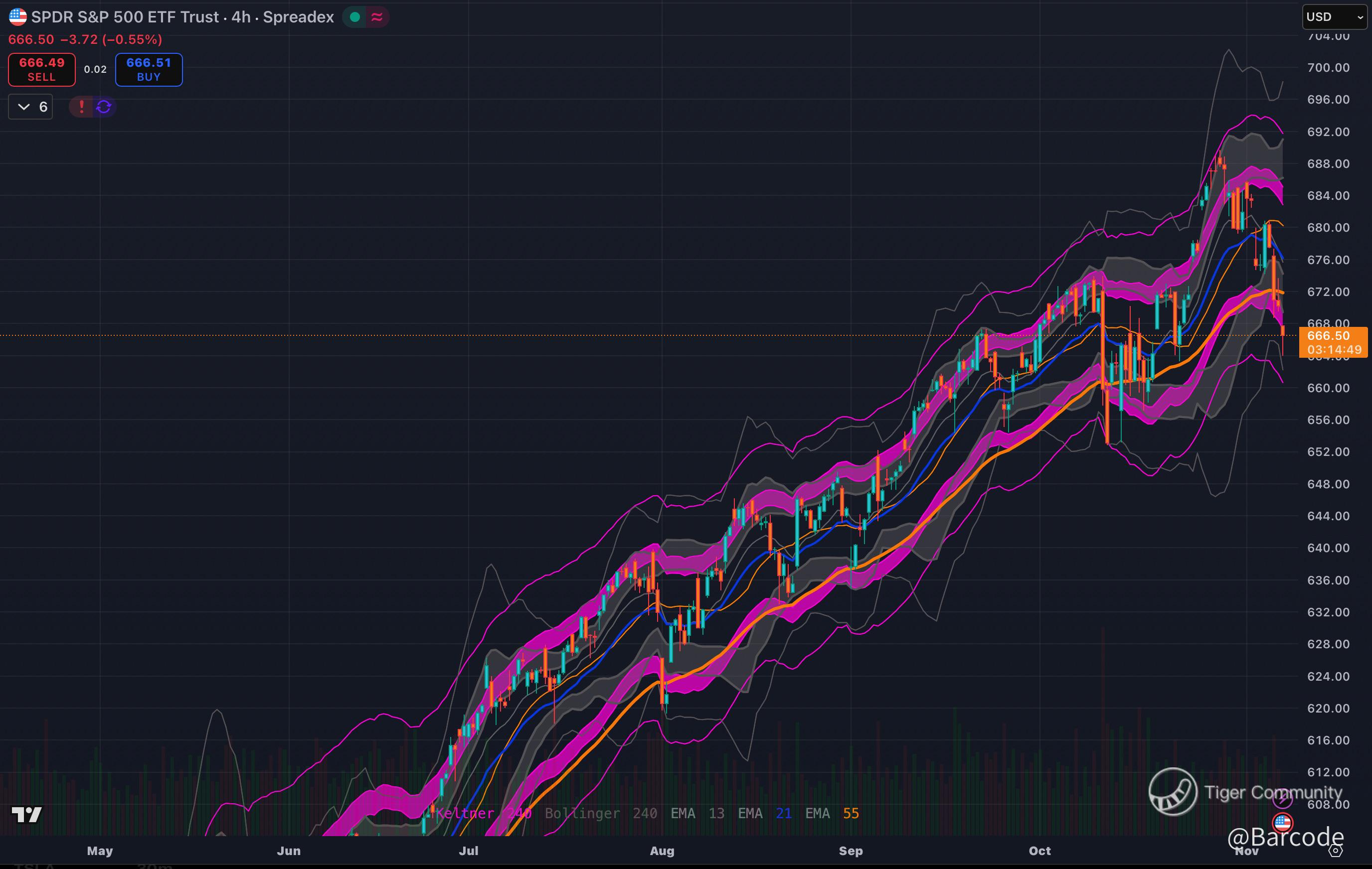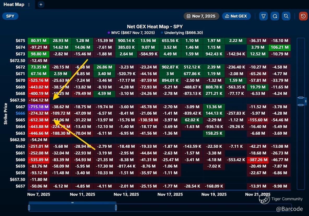 The 6666 level aligns with the 50-period EMA, mid-Keltner baseline, and prior swing confluence. SPYโs scalar equivalent is 666.90; a breach triggers gamma acceleration as Net GEX density flips negative below 6700.