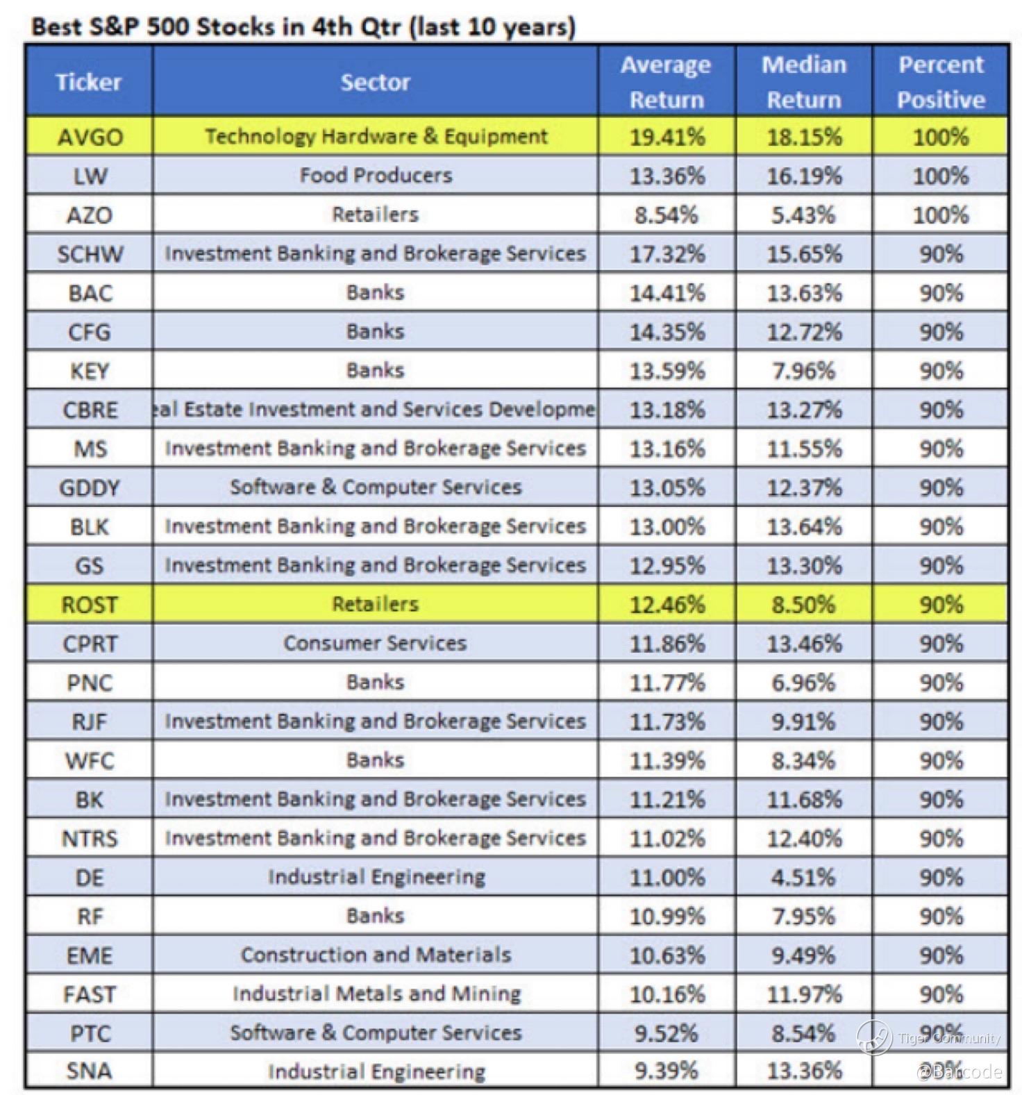 AVGO leads with an average Q4 return of 19.41 %, followed by LW (+13.36 %), AZO (+8.54 %), and BAC (+14.41 %).