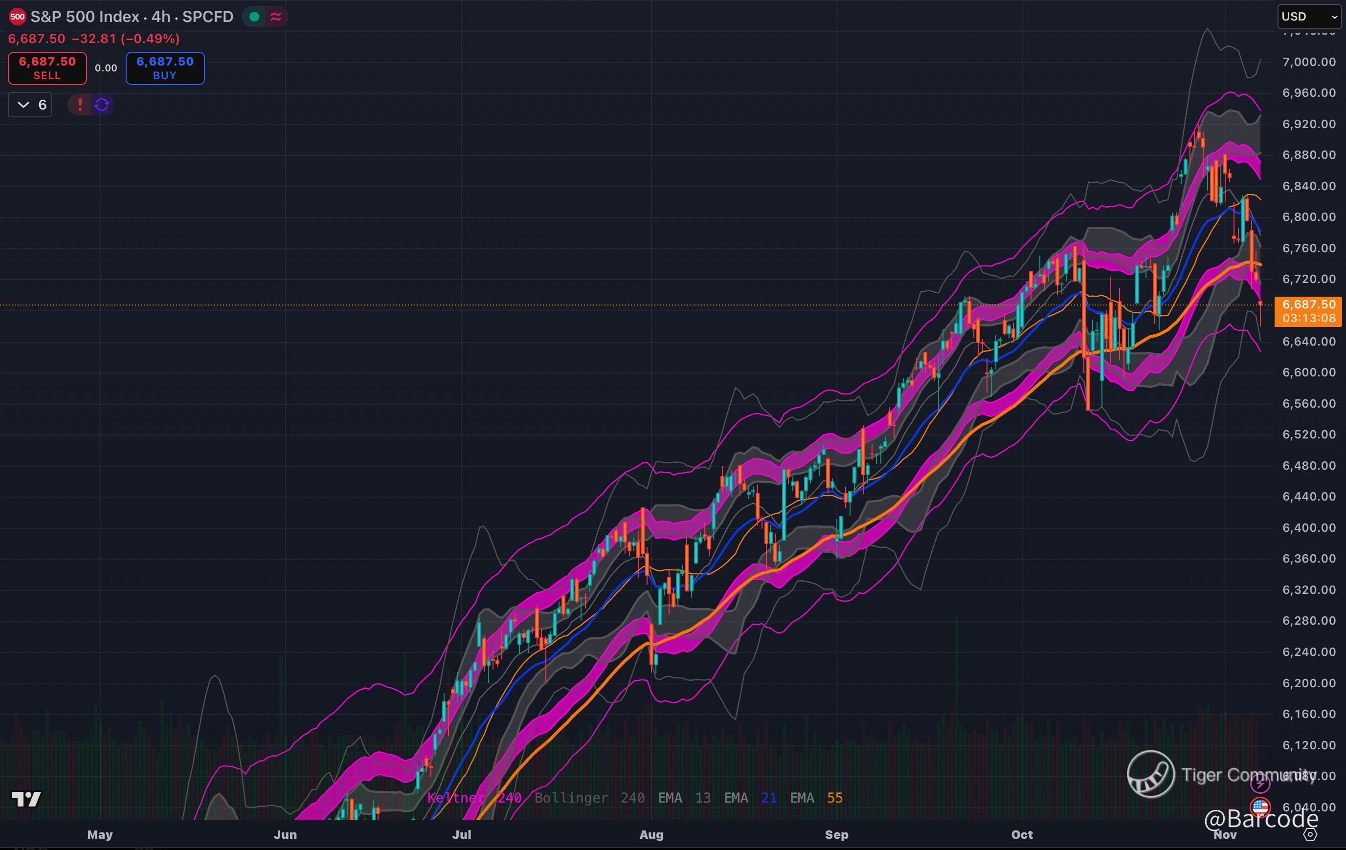 The current range is boxed between 6655โ6710 support and 6871โ6993 resistance. The breakout direction will determine Novemberโs bias vector.