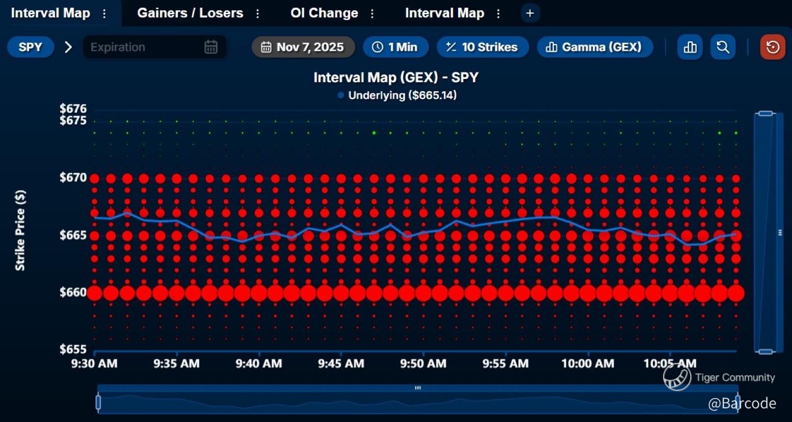 Heavy negative gamma is stacked from $660 to $670 on $SPY this morning. Interval Map data shows exposure isnโt rotating or unwinding, suggesting pinned price action that can amplify moves once a breakout occurs.