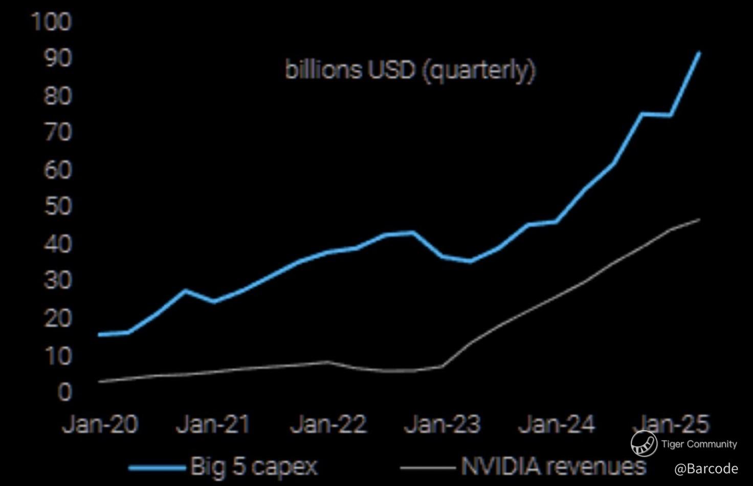 The Big 5โs capital expenditure curve has exploded to nearly $90B per quarter, while Nvidiaโs revenue expansion continues trailing beneath it. The entire AI ecosystem is now leveraged to this capex intensity. $NVDA canโt afford for AI spending to decelerate; every revenue acceleration cycle depends on hyperscaler investment velocity staying intact. If Big Tech tightens capital budgets, Nvidiaโs margin and volume momentum could flatten faster than models imply.