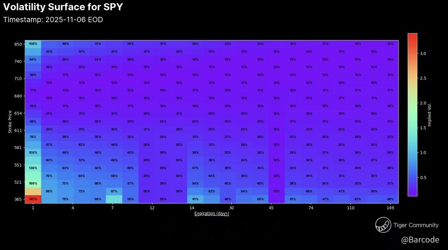 SPYโs volatility surface shows short-term options pricing in much higher volatility, traders expect big moves soon. Further out, volatility levels flatten, suggesting calmer expectations over time. In simple terms: near-term uncertainty, longer-term confidence.