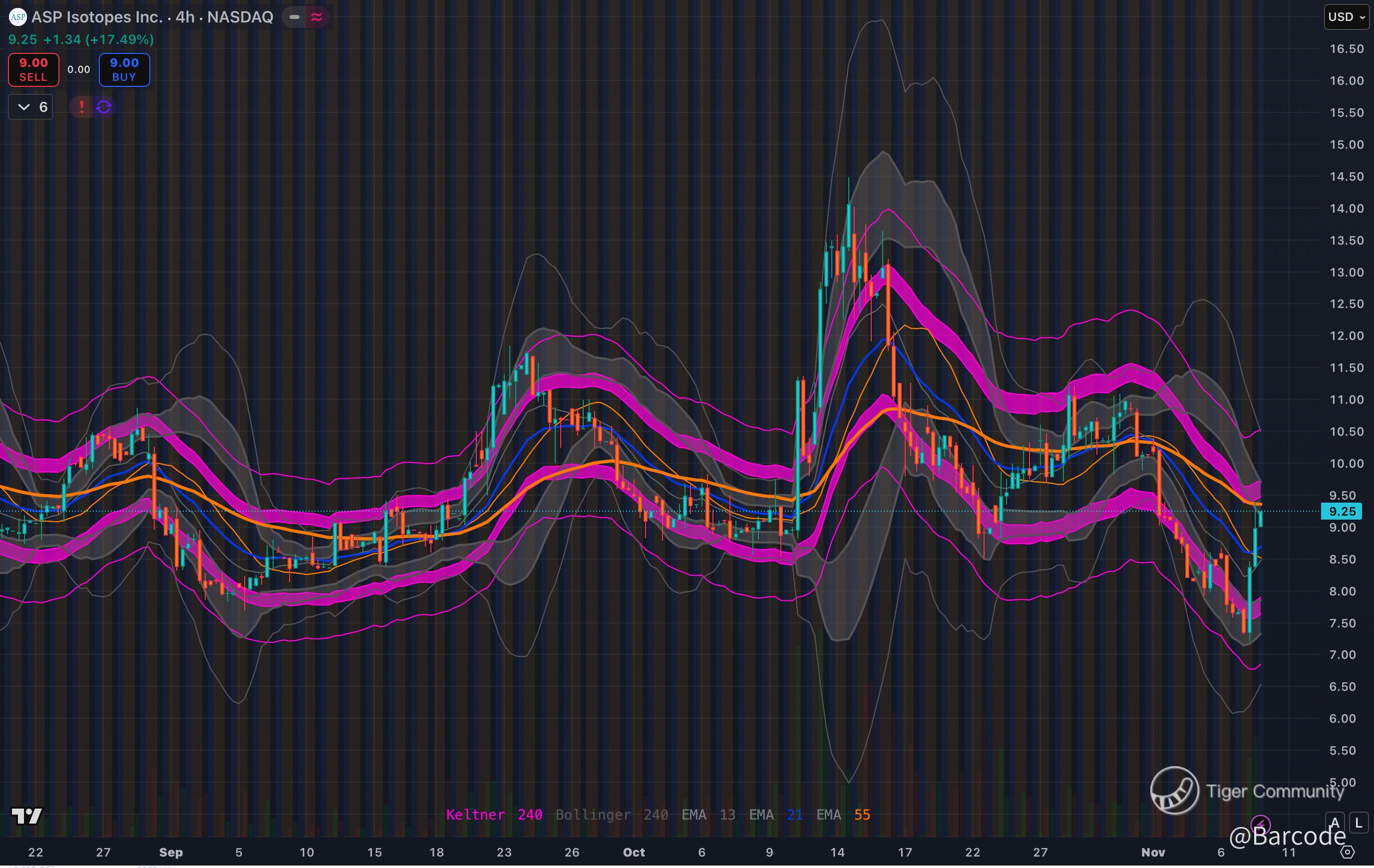 📈 Up +17.49% to $9.25 with strong rebound from Keltner midline support.