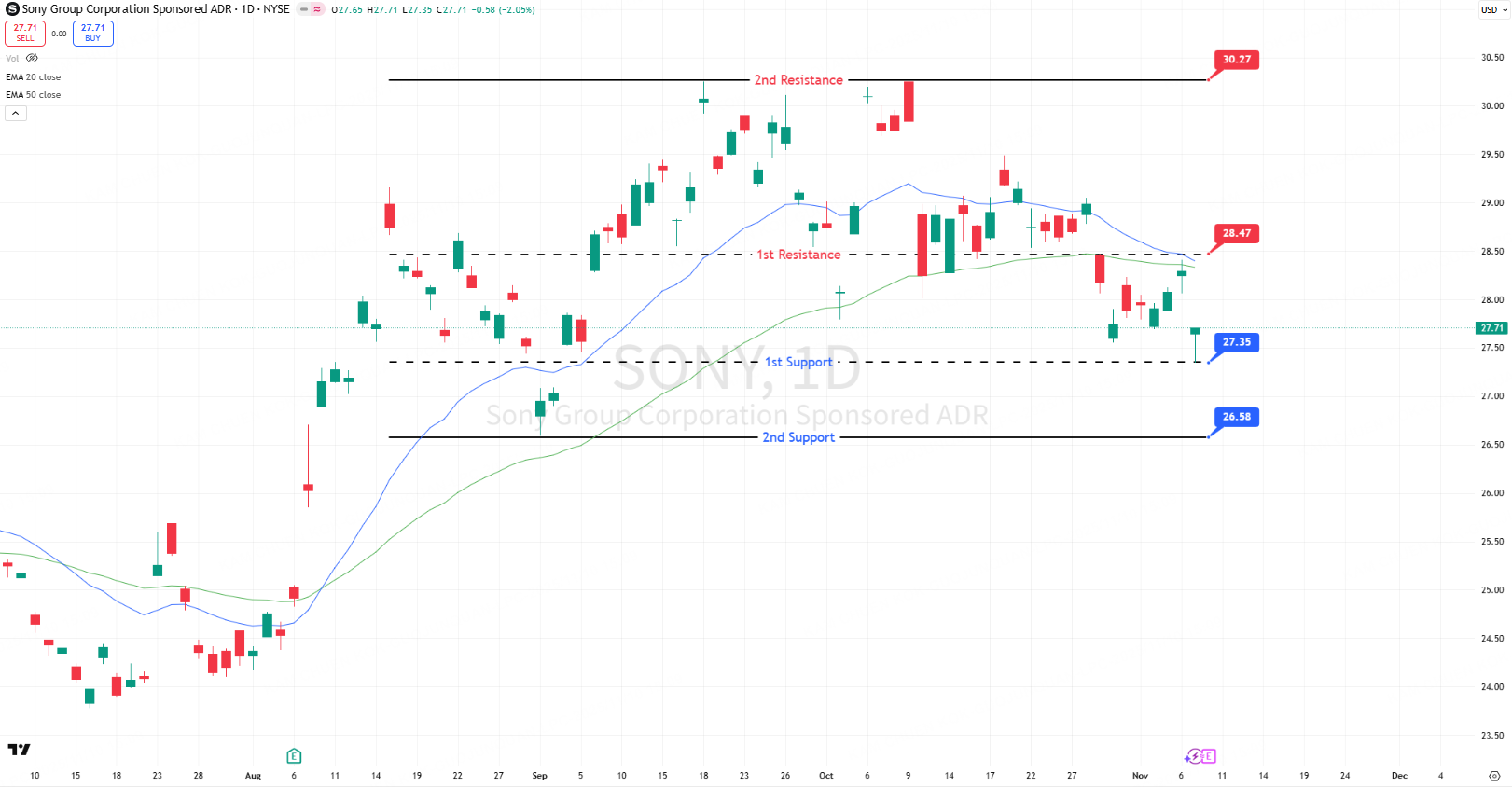 SONY remains sensitive to FX, gaming-segment performance, and macro consumer spending. Earnings-week volatility may amplify short-term swings. This technical analysis is based on TradingView and Yahoo Finance (Nov 7 2025) data and is for informational use only — not investment advice.