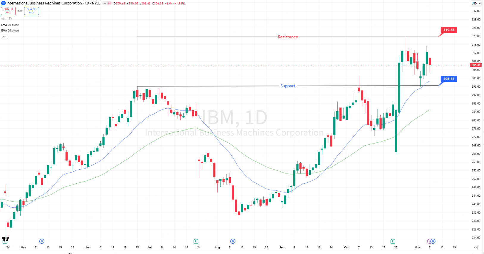 IBM closed at $306.38, down 1.93% on lighter-than-average volume (~4.15M vs ~5.40M). It sits ~4.1% below its 52-week high ($319.35) after a strong October/early-November run.