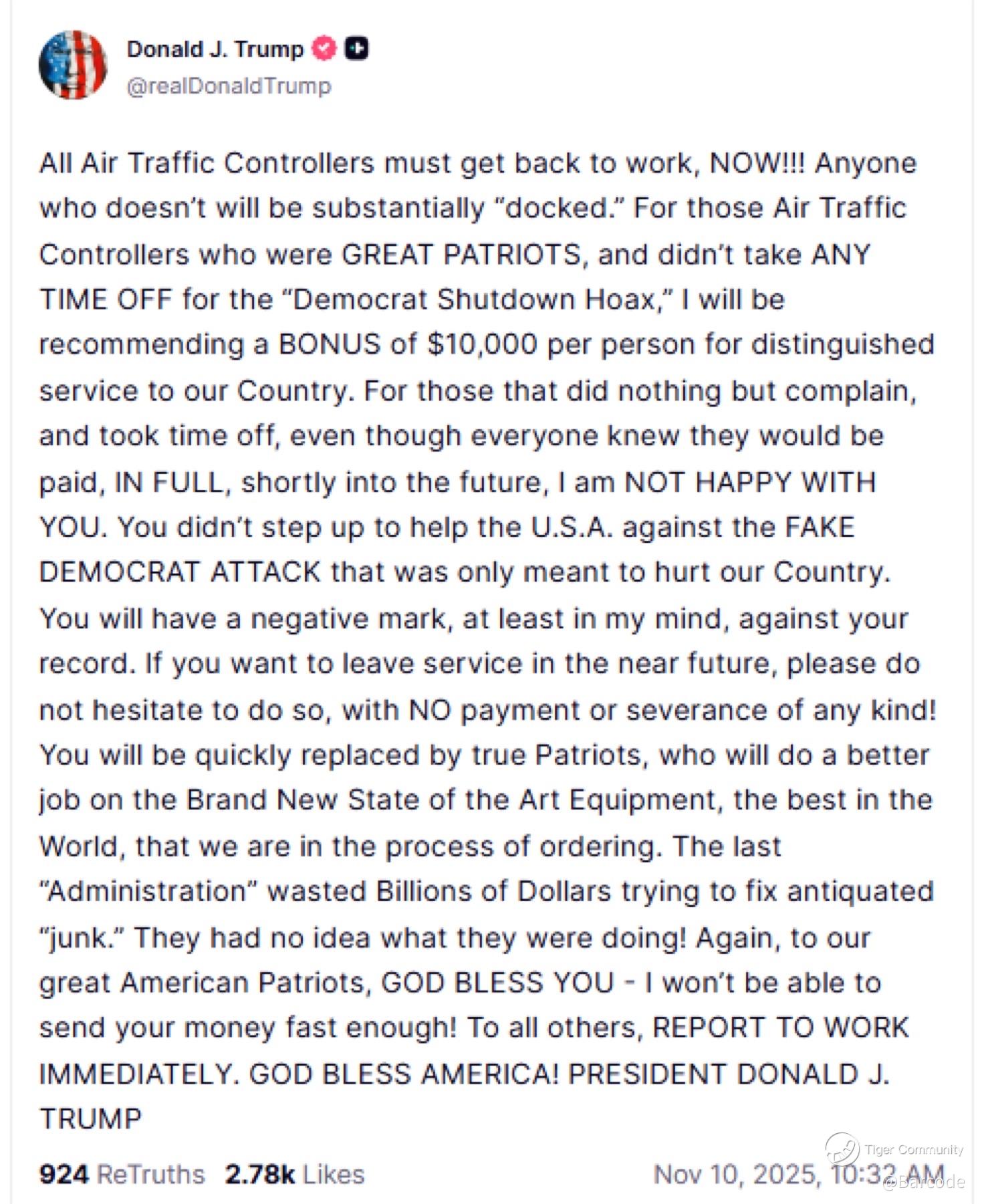 Trump’s post telling air traffic controllers, “If you want to leave service, please do so,” wasn’t about aviation; it was about asserting dominance. Markets read that as a political volatility spark, not instability. It’s performative power at a moment when traders are hunting for catalysts, and it sets the tone for fiscal authority driving sentiment more than fear.