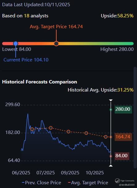 Based on 18 analysts from Tiger Brokers offering 12 month price targets for Circle Internet Group, Inc. Class A in the last 3 months. The average price target is $164.74 with a high forecast of $280.00 and a low forecast of $84.00. The average price target represents a 58.25% change from the last price of $104.10.