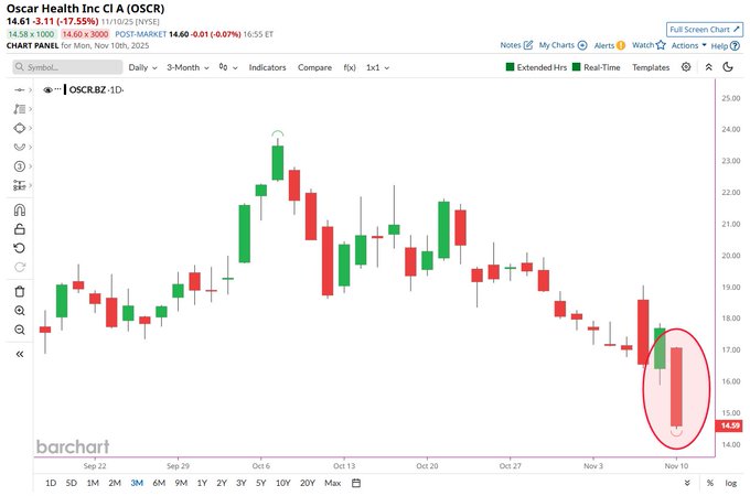 Oscar Health $OSCR plunges more than 17% for its 5th biggest loss in history 📉📉