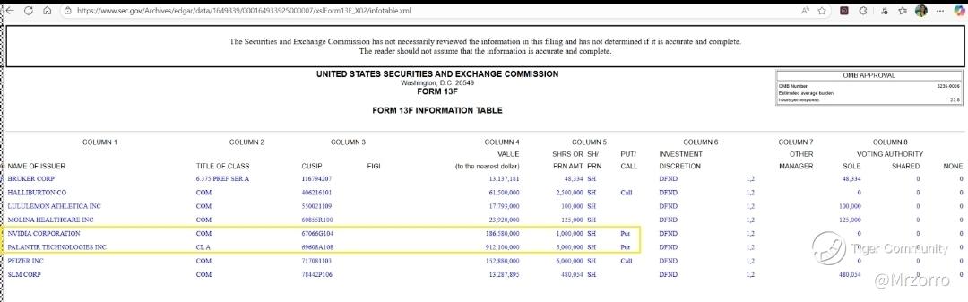 While his company, Scion Asset Management, filed a 13F document showing it held put options that give their holder the right to sell 5 million Palantir shares and put options on 1 million $NVIDIA (NVDA.US)$ shares, the document was based on positions as of Sept. 30 and the holdings in the portfolio may have changed since then.