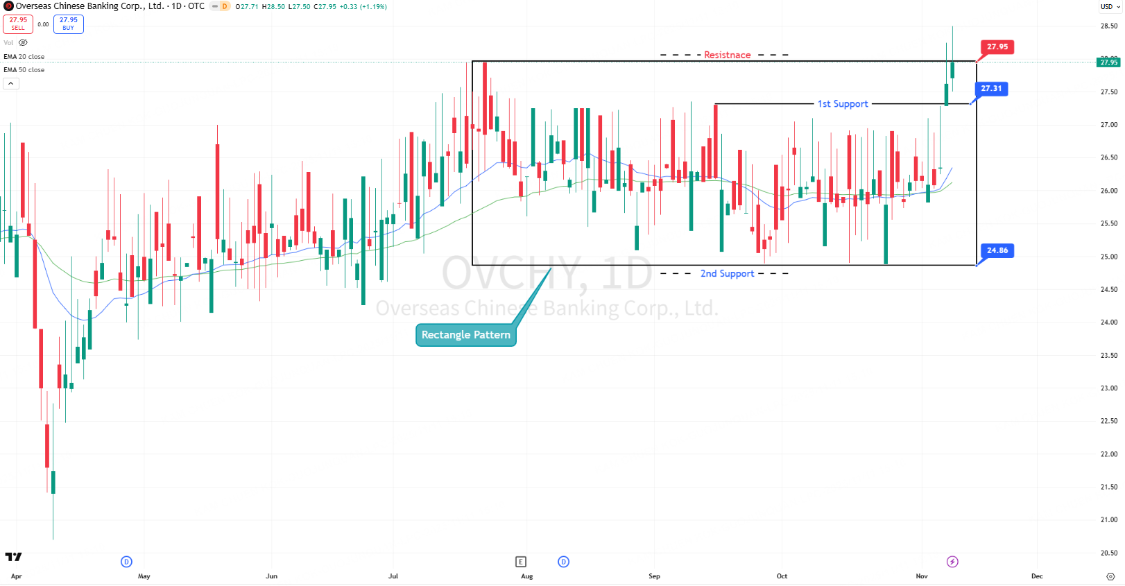 $27.95 (+1.19%): Multi-month breakout with RSI >75 — momentum surge on strong Singapore bank flows