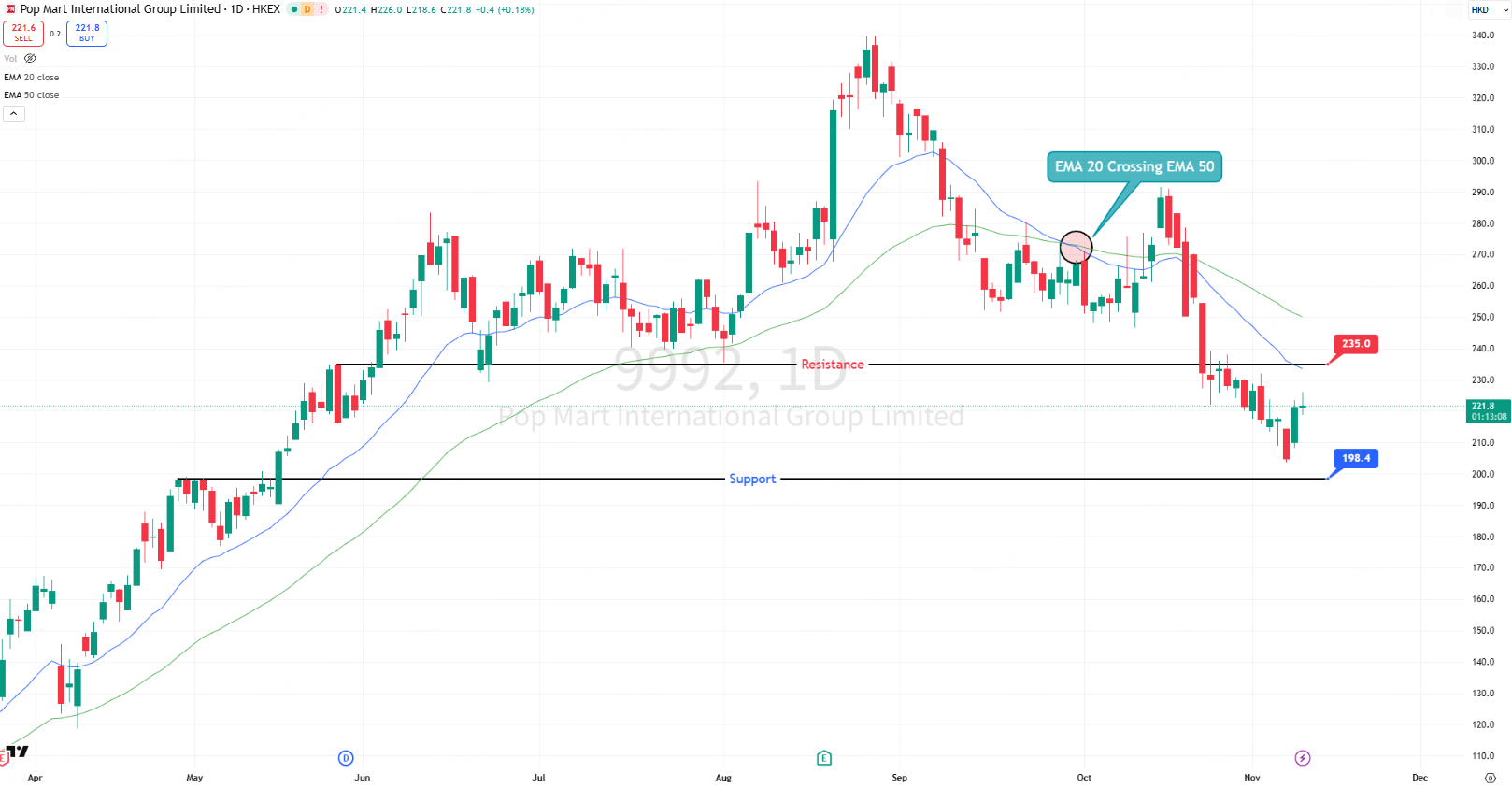 Immediate resistance: HK$233–235 (EMA-20 / recent breakdown area)