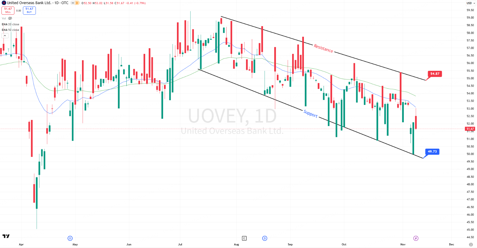 United Overseas Bank Limited ADR (UOVEY) closed at $51.75, slipping 0.38% on light volume and extending its short-term downtrend.