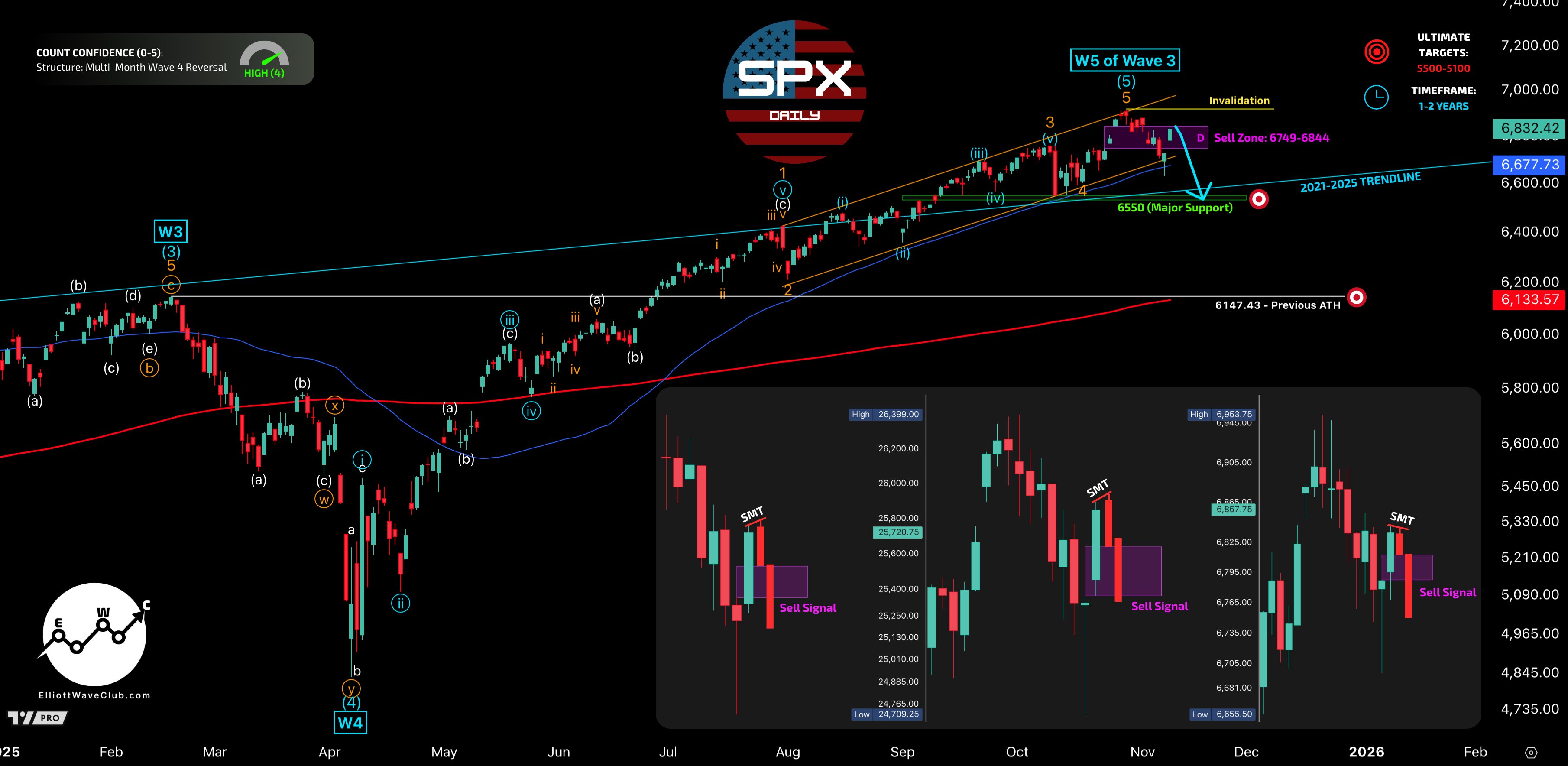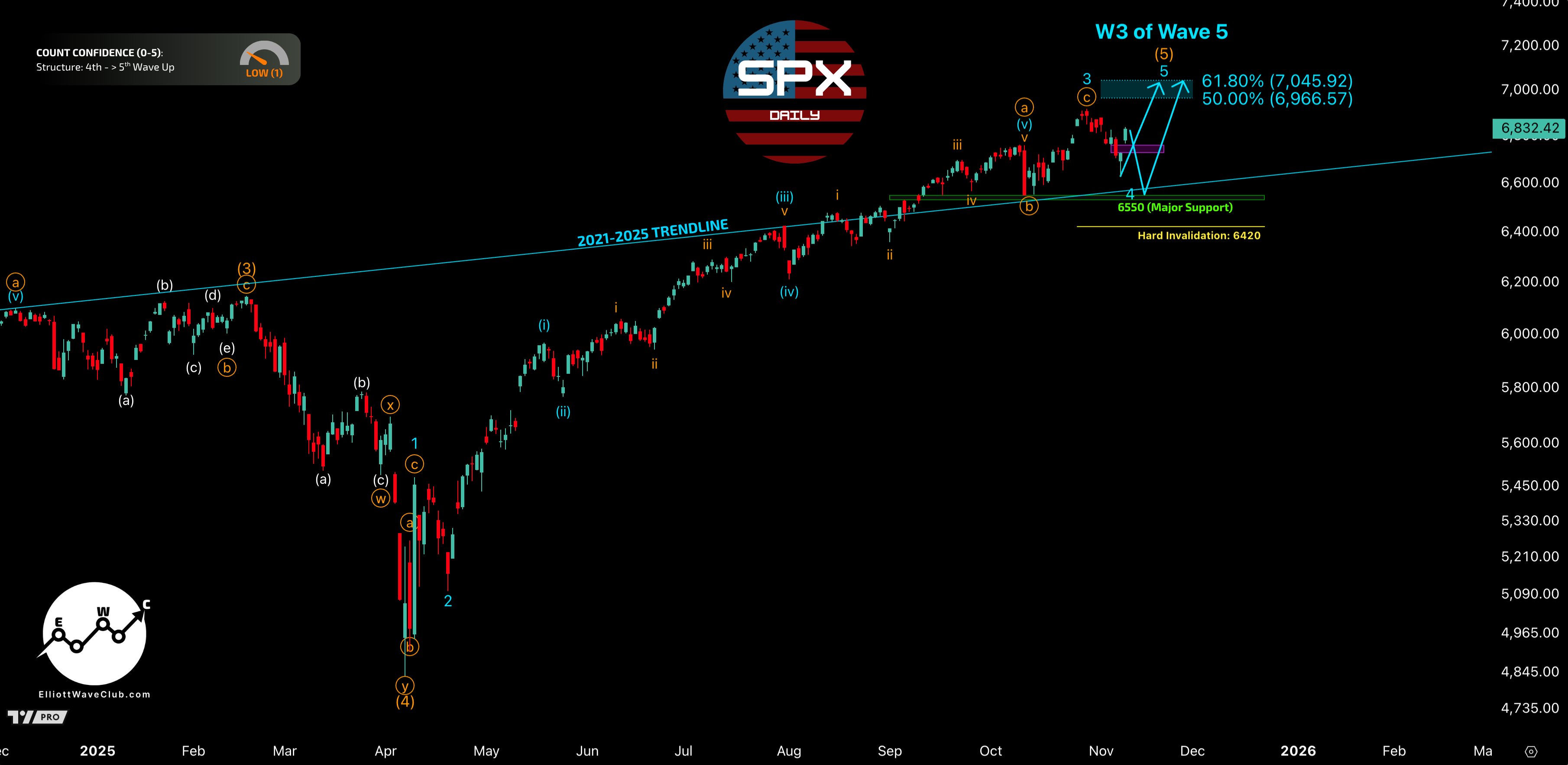 This alternate is invalid below 6420 and very unlikely below 6550, as that would breach the 2021–2025 trendline and Weekly FVG major supports.
