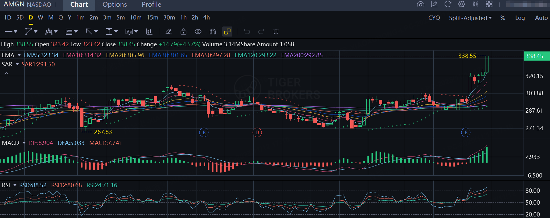 $Amgen(AMGN)$ was even stronger, with the 4.6% gain pushing it to fresh 52-week highs near the historic peak of $346.8. Mainly benefiting from 37% biosimilar growth in Q3 and a strategic partnership with Lonza to reduce R&D risks. RSI shows ample momentum.