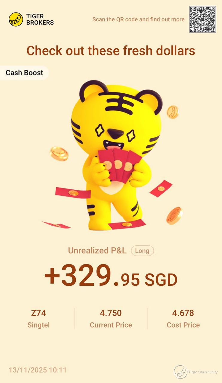 $Singtel(Z74.SI)$ Singtel's H1 earnings are impressive! Net profit jumped 176% to $3.4B, largely thanks to the partial sale of its Airtel stake. I'm bullish on its expansion in APAC AI data centers, and it's actively hunting for M&A. Sadly, I completely missed that sweet $688 cash voucher promo — still kicking myself! Holding this for the long term though, the future looks bright.