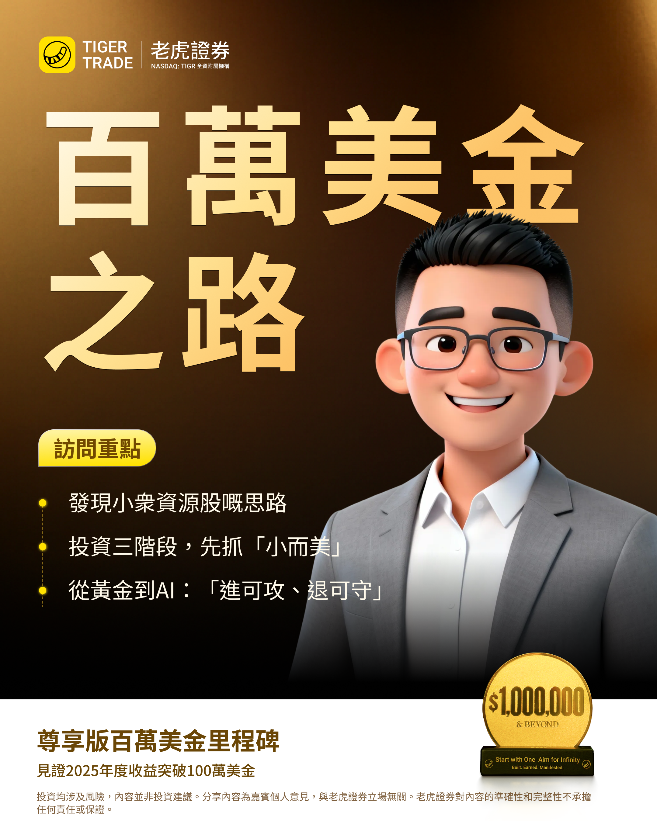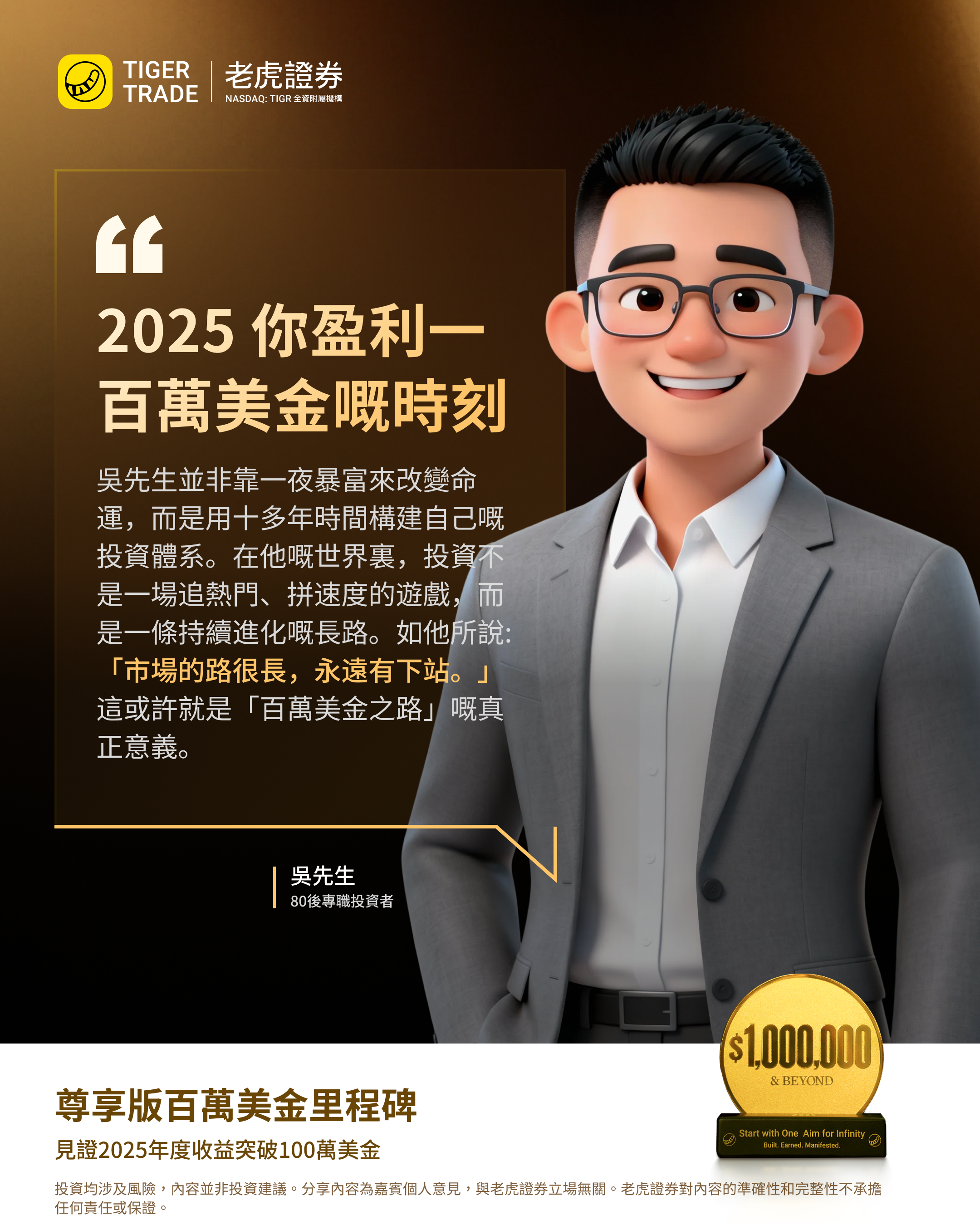 對老虎來說,投資不只是盈虧的數字,而是一段從夢想到達成的旅程。我們希望這些故事,激發更多人樹立屬於自己的投資目標,讓「百萬美金」從遙遠的夢想,變成看得見、夠得着的里程碑。