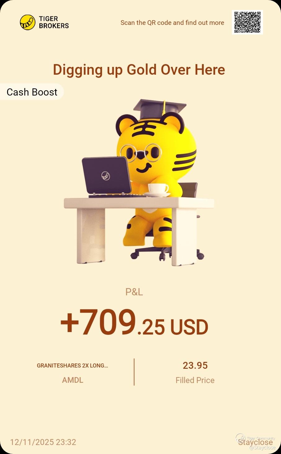 On November 12th, we're excited to see @Stayclose winning a profit of SGD 1283 by investing in $GRANITESHARES 2X LONG AMD DAILY ETF(AMDL)$.