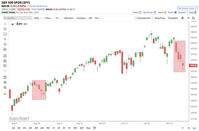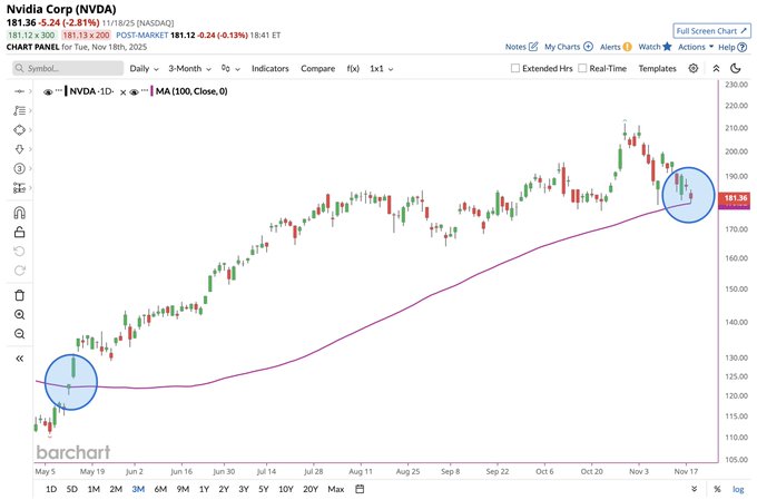 Nvidia in danger of closing below its 100-day moving average for the first time since May 🚨📉