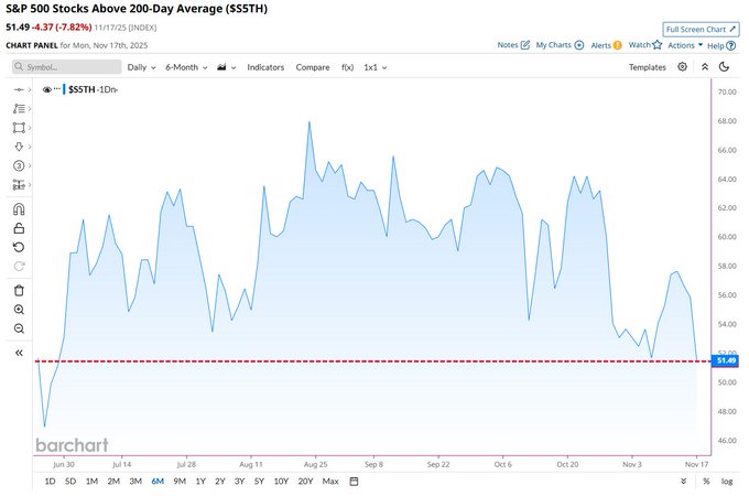 Only 51% of S&P 500 stocks are currently trading above their 200-day moving average, the worst market breadth in 5 months 🤯👀