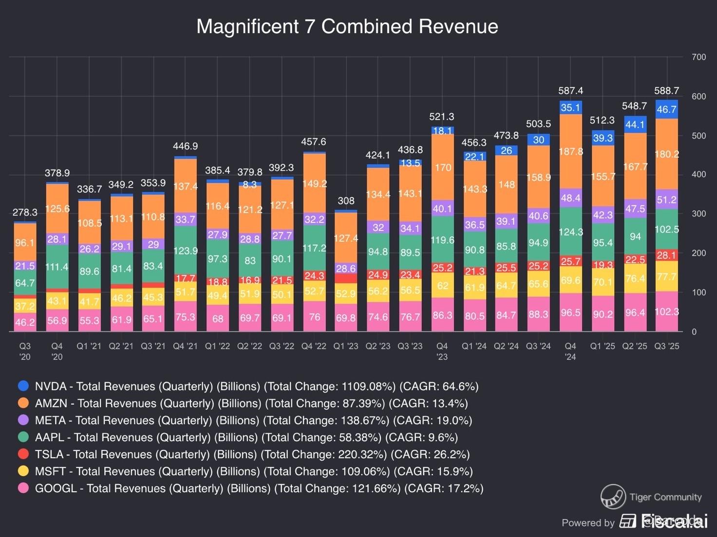 The leadership break inside the Magnificent 7 has accelerated. Combined Q3 revenue reached $588.7B, up from $278.3B in Q3 2020, yet performance dispersion is now extreme. Alphabet leads 2025 at 54.7%. Nvidia follows at 38.9%. Microsoft is at 15.6%. Apple at 7.2%. Amazon at 1.5%. Meta at 0.8%. Tesla flat. The past three months have moved faster; Alphabet is up roughly 45%, Meta is down more than 21%, Nvidia is marginally positive, and Amazon, Microsoft, and Apple remain negative. The index rebound since early November has been carried by one ticker.