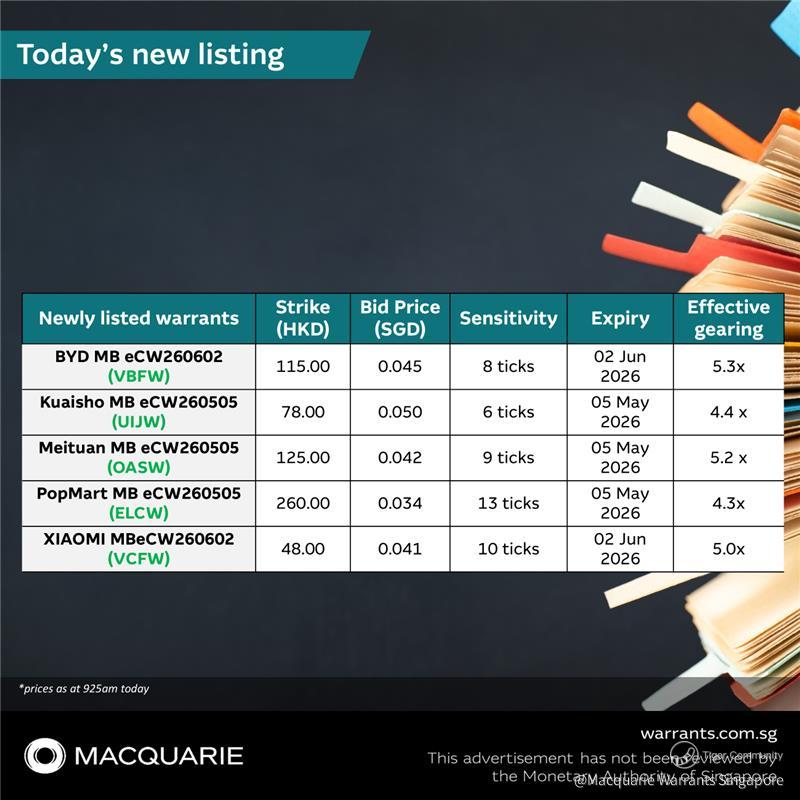 🆕Macquarie has listed new call warrants over BYD, Kuaishou, Meituan, PopMart and Xiaomi this morning. Amongst the stock underlyings, Meituan is the only remaining company that has yet to report their third quarter earnings. Meituan will report this Friday