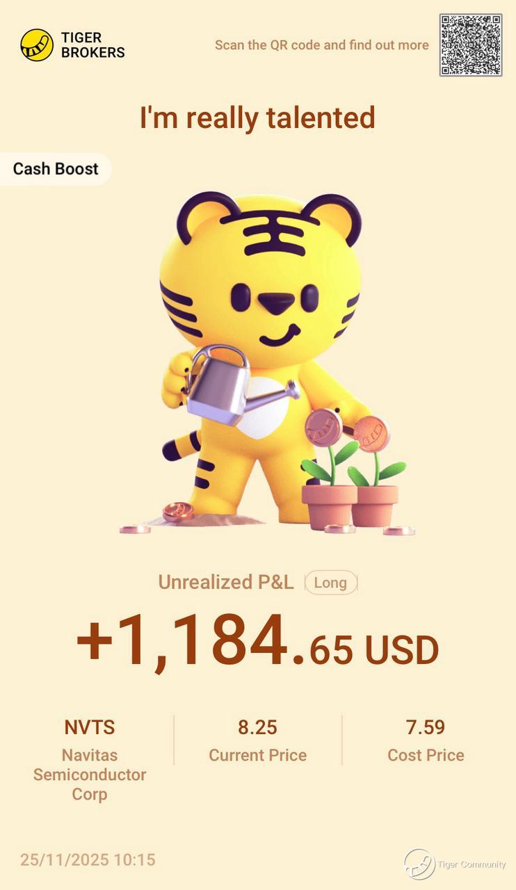 $Navitas Semiconductor Corp(NVTS)$ The toughest days are behind us! Perfectly timed this rebound with NVTS, and scored the Contra 688 offer—snagged SGD 688 in Cash Boost vouchers just for jumping in. Feeling even more confident in my strategy now, ready for the next leg up!