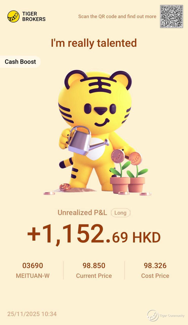 $MEITUAN-W(03690)$ My conviction is growing stronger! Meituan's current play is to solidify its lead in the local services marathon and await the next industry disruption. Once autonomous delivery tech truly matures, its massive, hyper-efficient network and ecosystem will become an unstoppable force – that's when it will really take off. P.S. Just hopped on the Contra688 promo – snagged SGD 688 in Cash Boost vouchers. Tiger, this offer is absolutely fire!