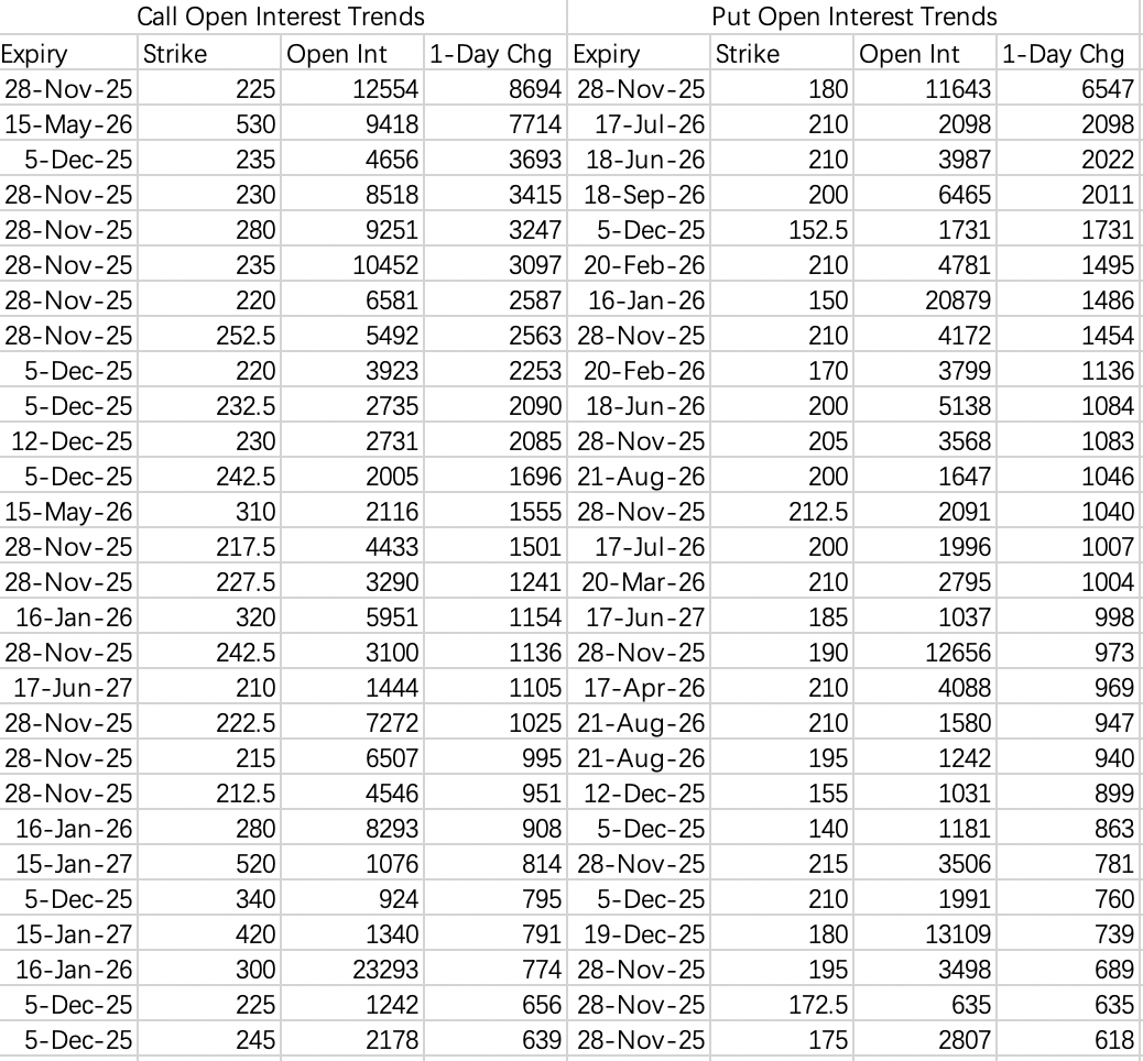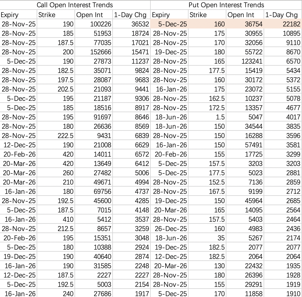 Same logic applies to NVDA. It'll likely hold above $165 this week, but $160 is on the menu for next week. Even though the Dec 5th 160 put is a sell, the overall open interest tells us the expected price level has shifted lower.