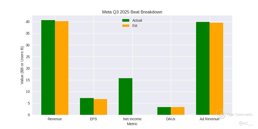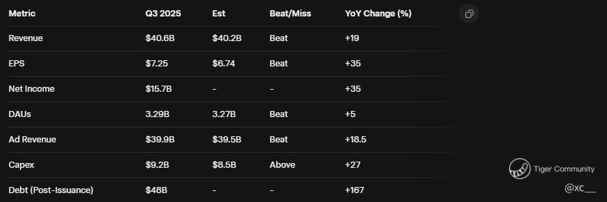 Earnings Edge: Beat or Bust in Disguise? πͺπ€ Q3 delivered fireworks β revenue $40.6B (beat $40.2B est), net income $15.7B (up 35% YoY), but capex jumped 27% to $9.2B on AI infra. Bears pounced on "missed expectations" spin (perhaps user growth at 5% vs hoped 6%), tanking shares 5% post-print. Rebound reality: Ads revenue $39.9B (up 18.5%), with AI tools boosting ROI 20% for advertisers. If Q4 guidance ($46-48B) holds, gap fills fast β but slowing Reality Labs losses ($4.4B) remain a drag.