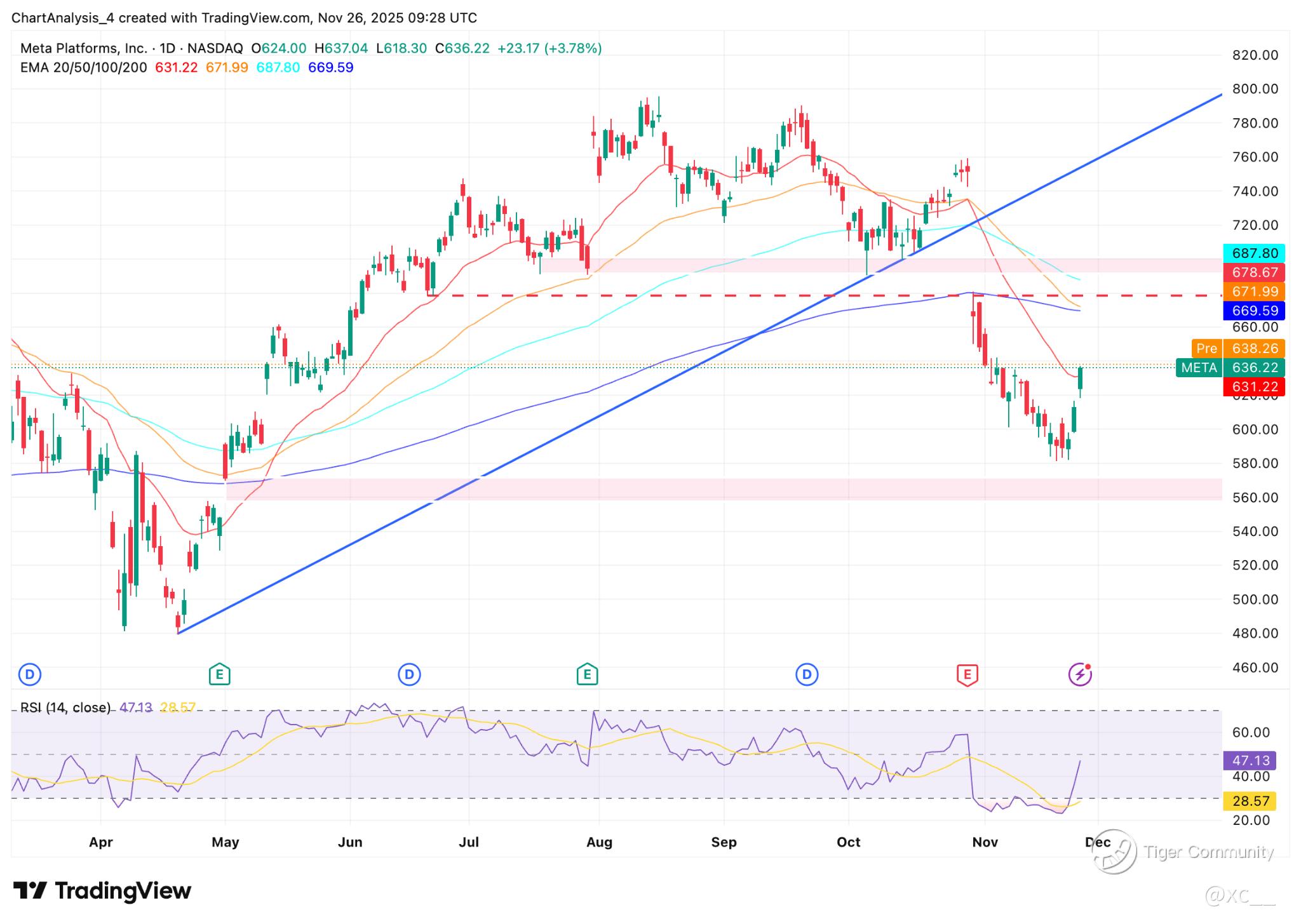 Technical Turbo: Rebound Rails or Resistance Roadblock? π―π Daily chart screams bullish: RSI reset to 55 from oversold 40, reclaiming 50-day MA at $610. Yesterday's 3.8% thrust eyes $650 resistance β break it for $700 gap fill. Support at $580 holds firm. Volume spiked 25% on rebound, signaling conviction. But if tariffs crimp global ads, pullback to $550 looms.