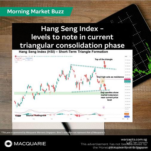 SGX Academy Trainer Binni Ong shares her view on the $HSI(HSI)$, which she believes is currently trapped in a triangular consolidation pattern with Doji highs acting as an immediate resistance. A break out from this consolidation pattern may signal a trend change. Binni concludes with the HSI warrants one can use to trade the HSI at key support/resistance levels. Read on for Binni's view: https://warrants.com.sg/marketnews/highlight/todayhighlight/7775