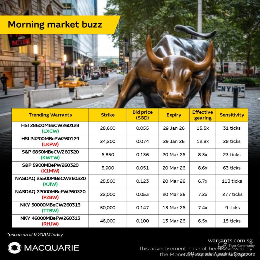 – Investors keen to trade the moves in the US indices, China-related indices of HSI and HSTECH as well as the Nikkei225 may wish to do so via Macquarie's trending index warrants: https://warrants.com.sg/education/Indexwarrants