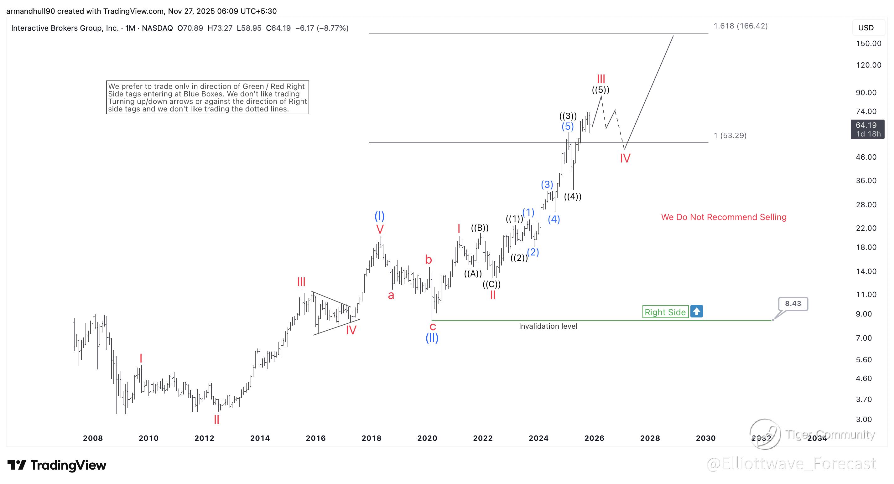 Interactive Brokers Group (NASDAQ: IBKR) continues to maintain a resilient bullish structure, supported by a clear Elliott Wave progression. The stock has recently completed a significant corrective phase and has now entered what appears to be an impulsive and potentially explosive bullish cycle. Understanding this wave structure is essential for traders looking for opportunities, especially as price action unfolds toward higher Fibonacci targets.
