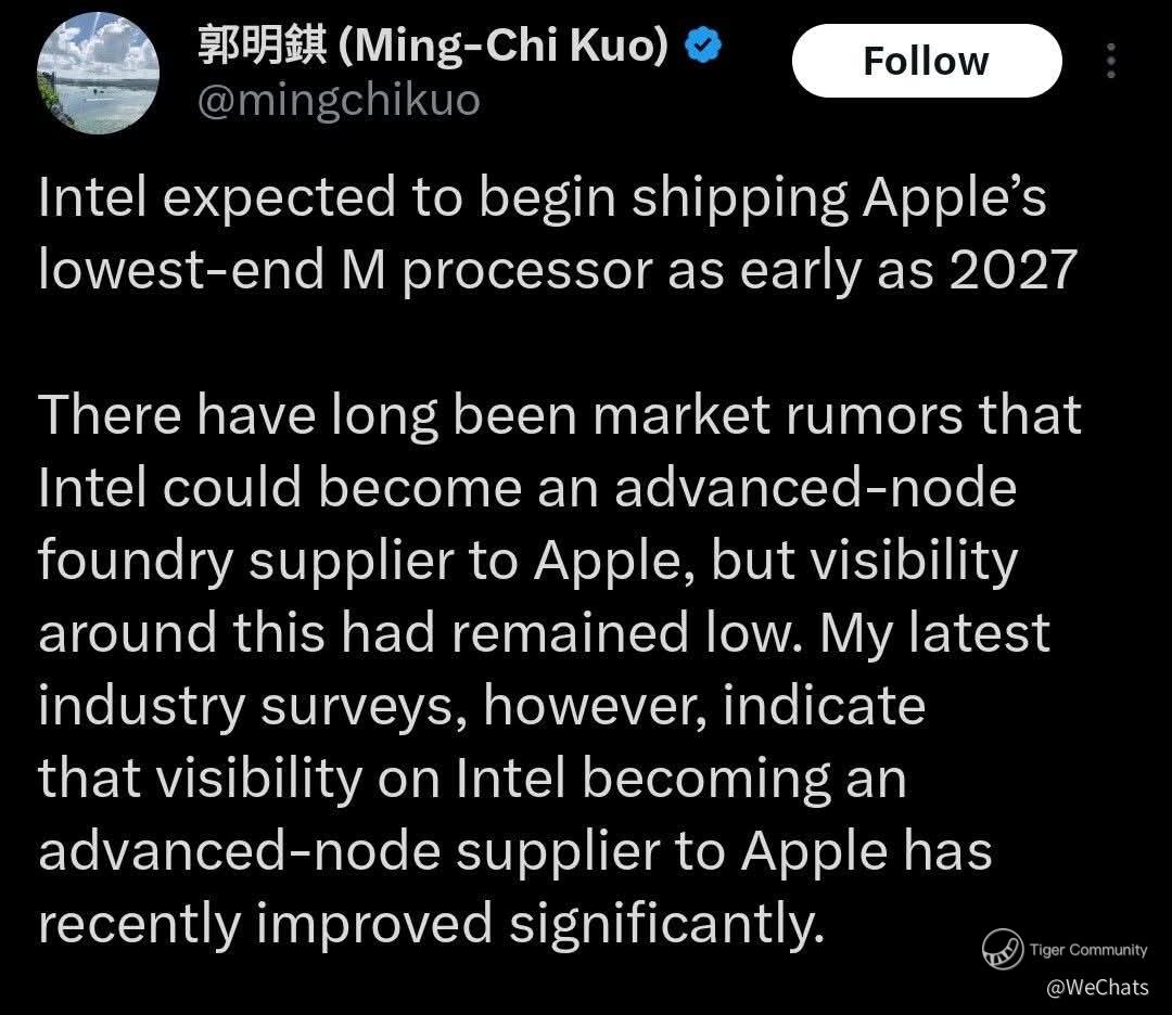 👉 Apple may start using Intel to manufacture its M-series chips as early as 2027.